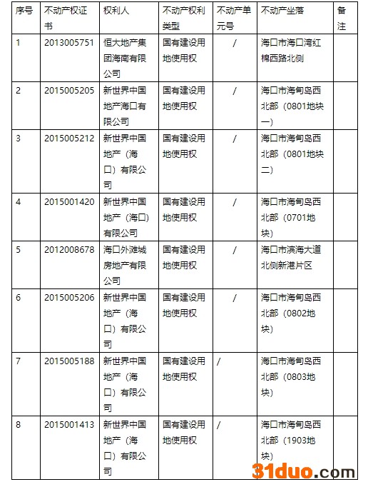 12月13日,海口市自然资源和规划局发布不动产权证书作废公告,不动产权证书编号分别为2013005751、2015005205、2015005212、2015001420、2012008678、2015005206、2015005188、2015001413的八宗地块,均存在因公司原因超过约定的动工开发日期满两年未动工开发建设的情况,故公告作废。地块涉及权利人有恒大地产集团海南有限公司及其旗下的海口外滩城房地产有限公司、新世界中国地产(海口)有限公司。