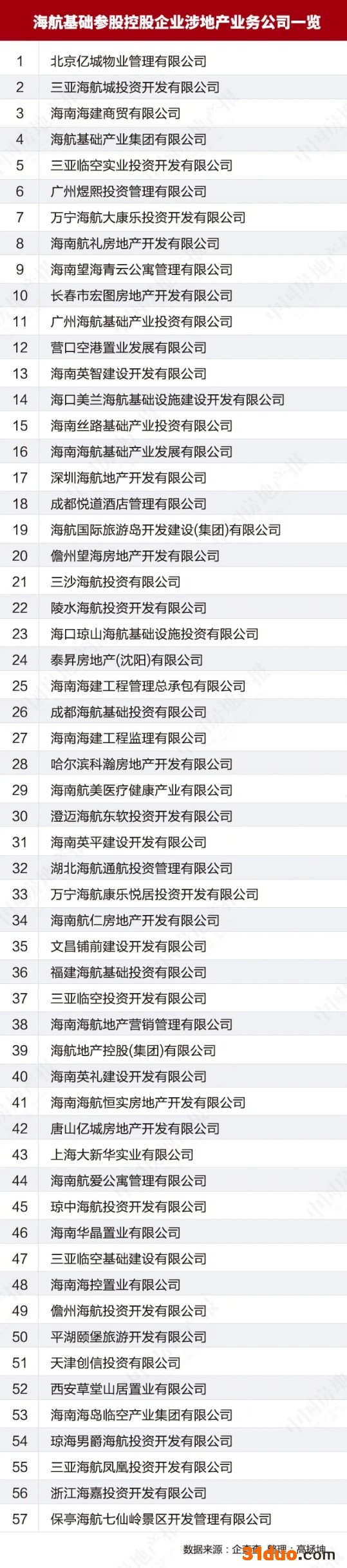 据中国房地产报记者不完全统计,截至发稿,海航基础参股控股企业共129家,涉地产业务公司共57家(包括部分物业管理、租赁、建筑公司,海航集团对外投资中涉地产业务公司约90家)。