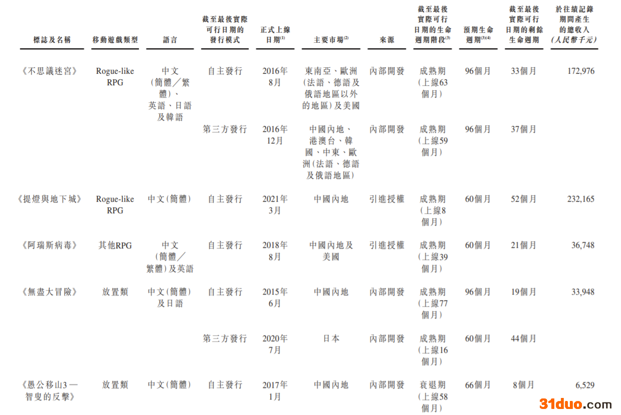 《提灯与地下城》于2021年3月推出首个月内流水突破1.85亿,连续六日在中国iOS十大免费游戏排行榜登上榜首,并在中国iOS游戏畅销榜上排名第四。而《不思议迷宫》及《无尽大冒险》因发布大幅更新的新版本而分别在各自推出日期后的第6个月及第51个月录得最高的每月流水。