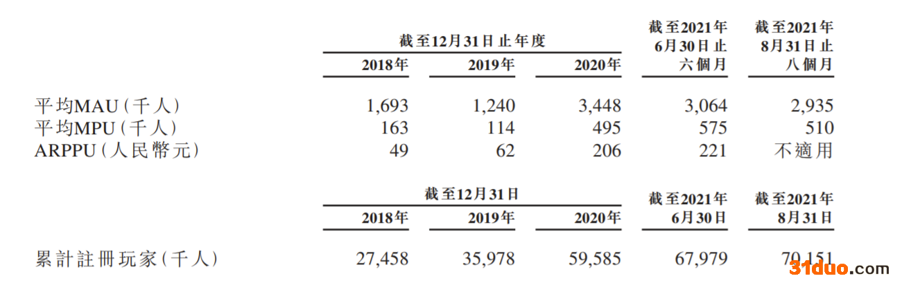 截至2021年8月31日,青瓷游戏的累计注册玩家超过7015万,平均MAU为294万人,平均MPU为51万人。截至2021年6月30日,ARPPU为221元。
