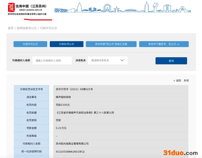 中华网财经12月15日讯:据信用中国江苏苏州官网消息,行政处罚决定文书号“苏环行罚字〔2021〕08第025号”显示,苏州阳光城商业