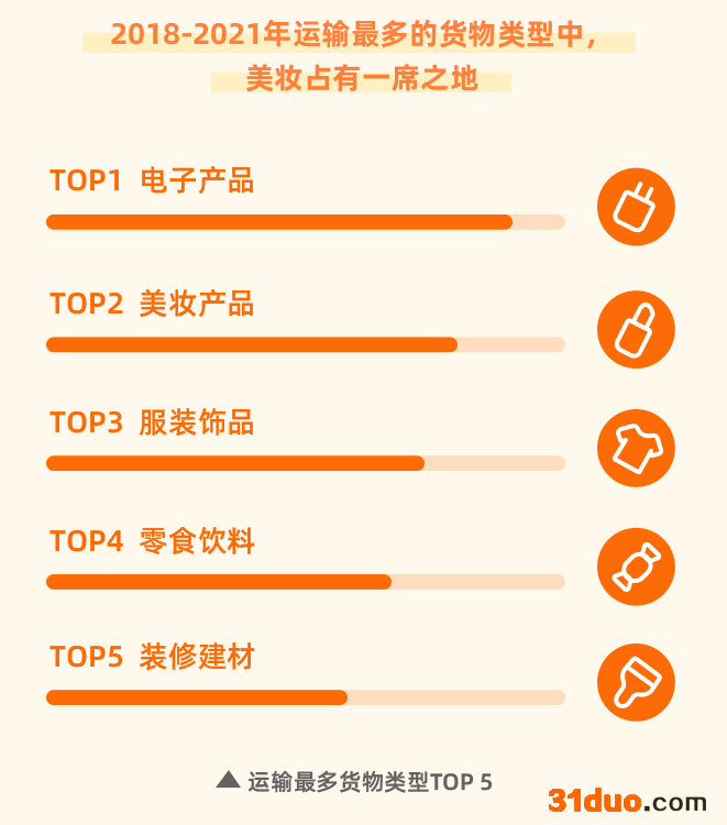 另一方面,2018-2021年间,电子产品仍是华强北运输最多的货物品类,持续享誉“中国电子第一街”的称号,但美妆产品运输量的表现也突出,仅次于电子产品。