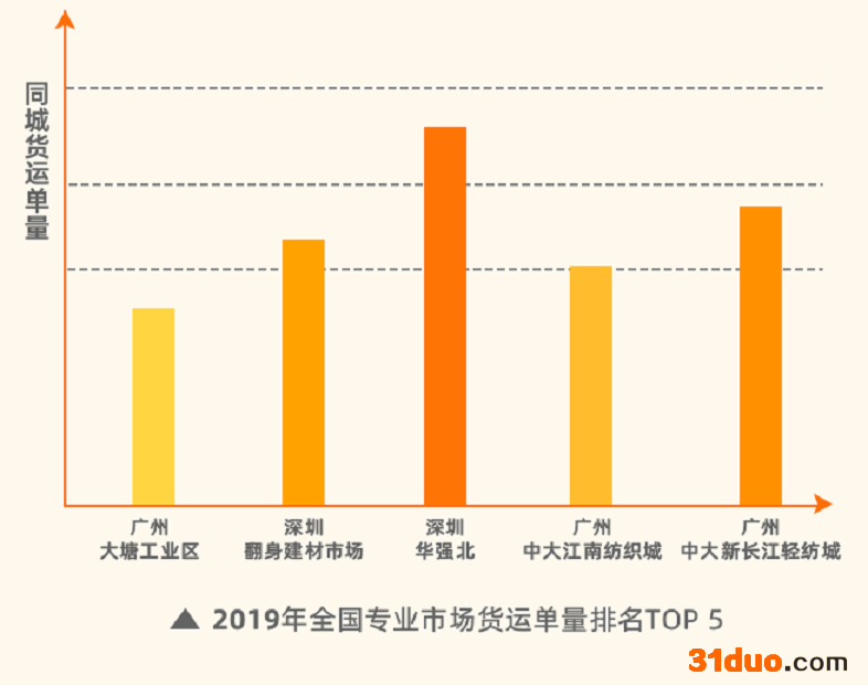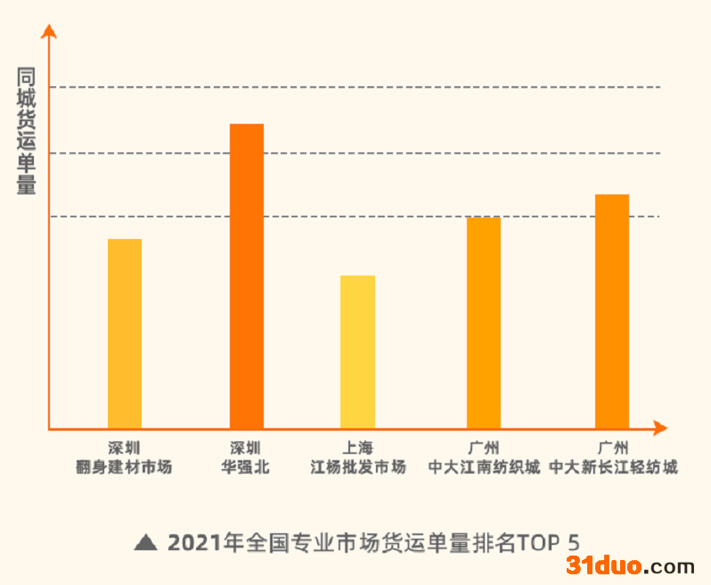 2019-2021年,华强北在全国专业市场同城货运单量排名里蝉联第一,广州中大新长江轻纺城则稳居第二。其中,广州重大江南纺织城、深圳翻身建材市场也连续3年进入排名前5名,货运量稳定。