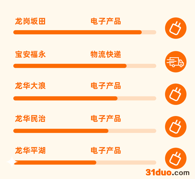 华强北的货物都去哪儿?数据显示,华强北的同城订单流向最多的片区依次是龙岗坂田、宝安福永、龙华民治、龙华大浪、龙岗平湖。同城订单的主要货物仍为电子产品,其中宝安福永为深圳的物流重镇,是物流快递品类的集散地;坂田则分布了多个电商园区,有不少跨境电商平台入驻,华强北大多数的出境货物以此为依托走向国外。