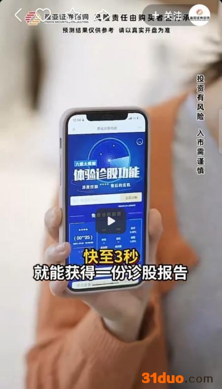 其中一条视频中某位情境女主对男主说到“但是你这只股,藏了十多条风险信息,主力资金都在撤出,这走势完全不对啊。”在男主疑问女主如何得知的时候,女主介绍到,“朋友推荐我一个深度诊股工具查的,就是一个在线免费诊股工具,不用下载也不用注册,可以从基本面、消息面、技术面来诊测,输入股票代码,快至3秒就能获得一份诊股报告,诊断报告还详细罗列股票数据以及买卖点分析。”