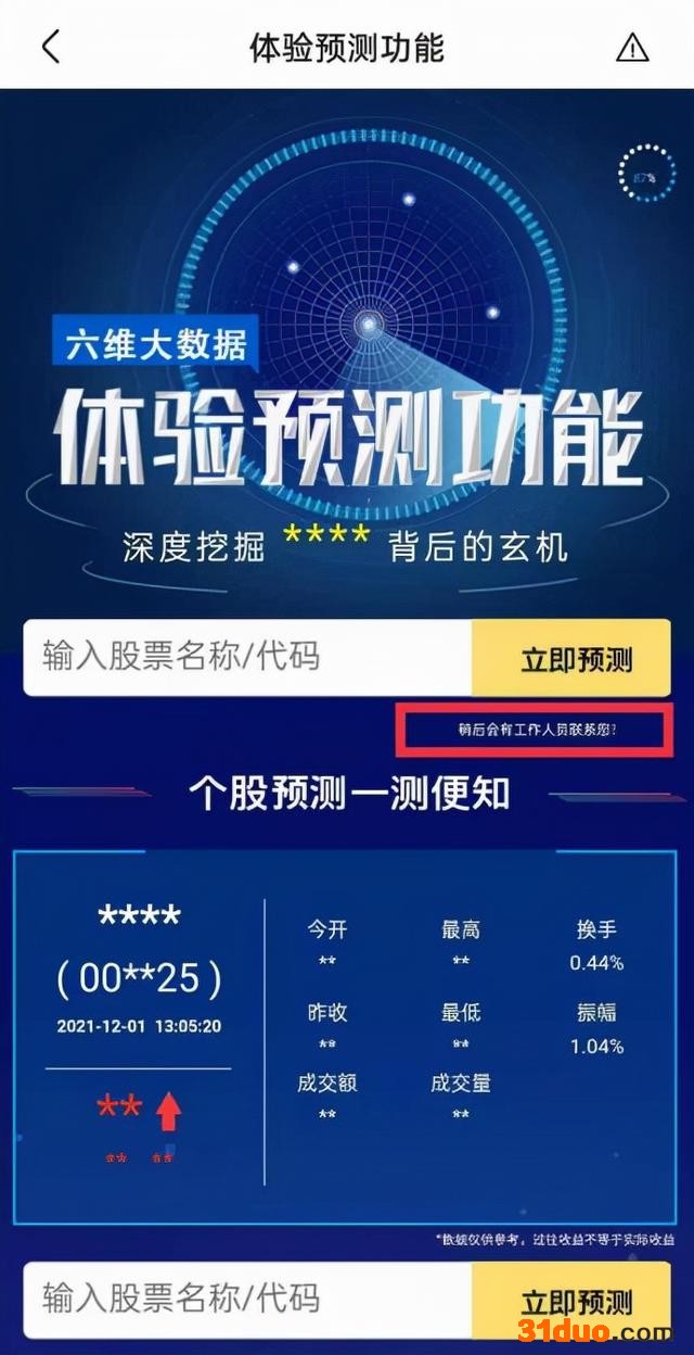 而在输入股票代码完毕后,点击立即预测,却又跳转出需要填写手机号码的输入框,并且显示“测评结果已计算完成,每个手机号限领一次”。此外,需引起注意的是,在免费查看按钮下方有一排小字标识着“郑重承诺,绝不泄露用户的个人信息”。但记者在填写手机号码诊断股票后,后面几天不断接到声称是证券机构、投顾机构的电话。