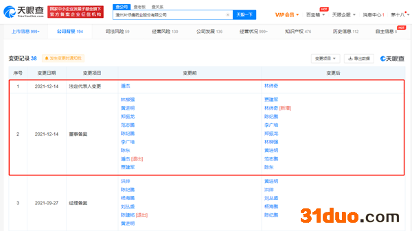中国网财经12月15日讯(记者杜丁 见习记者安荻)据天眼查App显示,漳州片仔癀药业股份有限公司(600436,“片仔癀)昨日发生变更,潘杰退出公司法定代表人及董事长,由林纬奇接任。