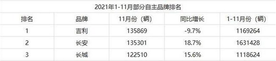 统计显示,今年11月,吉利汽车以13.59万辆的单月销量,重新回到自主品牌车企第一的位置,但领先的幅度十分有限。更重要的是,今年的累计销量已被长安汽车大幅超越,甚至很快要被第三位的长城汽车赶超。