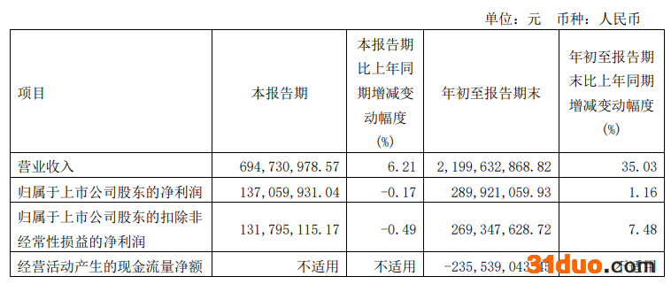 勘设股份三季报显示,今年前三季公司营业收入为22亿元,同比增长35.03%;归属于上市公司股东的净利润为2.90亿元,同比增长1.16%;归属于上市公司股东的扣除非经常性损益的净利润为2.69亿元,同比增长7.48%;经营活动产生的现金流量净额为-2.36亿元;基本每股收益为0.93元/股;加权平均净资产收益率为9.30%,同比减少1.26个百分点。