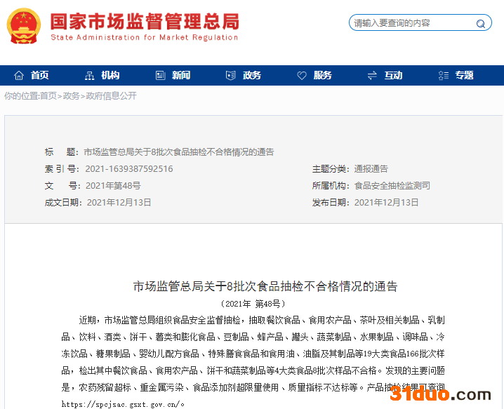 中国经济网北京12月15日讯 12月13日,国家市场监督管理总局网站公布了《市场监管总局关于8批次食品抽检不合格情况的通告》(〔2021年第48号〕)。近期,市场监管总局组织食品安全监督抽检,抽取餐饮食品、食用农产品、茶叶及相关制品、乳制品、饮料、酒类、饼干、薯类和膨化食品、豆制品、蜂产品、罐头、蔬菜制品、水果制品、调味品、冷冻饮品、糖果制品、婴幼儿配方食品、特殊膳食食品和食用油、油脂及其制品等19大类食品166批次样品,检出其中餐饮食品、食用农产品、饼干和蔬菜制品等4大类食品8批次样品不合格。发现的主要问题是,农药残留超标、重金属污染、食品添加剂超限量使用、质量指标不达标等。