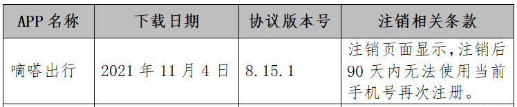 测评报告显示,嘀嗒出行(版本号:8.15.1)注销页面显示,注销后90天内无法使用当前手机号再次注册。