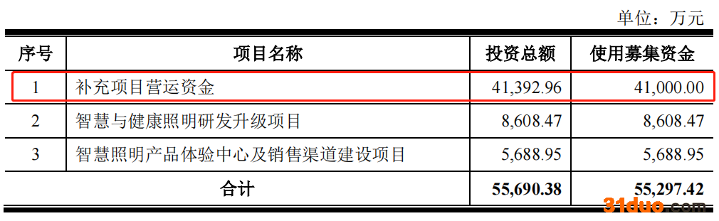 募集资金方面,金照明计划募集资金5.53亿元,其中4.1亿元资金将用于补充项目营运资金,8608.47万元将用于智慧与健康照明研发升级项目,5688.95万元将用于智慧照明产品体验中心及销售渠道建设项目。可以看到,此次募集资金中用于补充项目营运资金的金额占募资总额的74.14%。