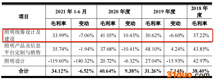 可以看到,照明统筹设计及建设的收入占营业收入的比例均超7成,然而该业务同期的毛利率却波动较大。报告期内,金照明照明统筹设计及建设的毛利率分别为37.22%、30.62%、41.05%和33.99%。