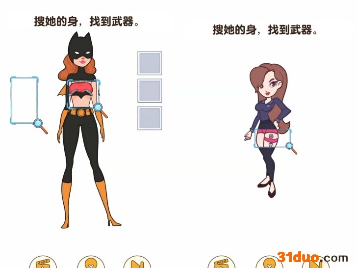 点击该链接用户便可参与游戏。进入游戏,画面显示,该游戏适合年龄12岁以上用户,但凤凰网《风暴眼》却发现在游戏第三关便出现使用透视镜“搜身”的游戏内容。该关卡显示画面有文字提示“搜她的身,找到武器”,解题方式为用透视镜工具沿着画面中一女性形象进行透视,透过衣服寻找藏在其身体上的武器,而武器通常藏在私密部位,如大腿上、内衣里。在凤凰网《风暴眼》度过第三关后,紧跟着的第四关更换了女性形象,但也是相同的解题方式和内容。