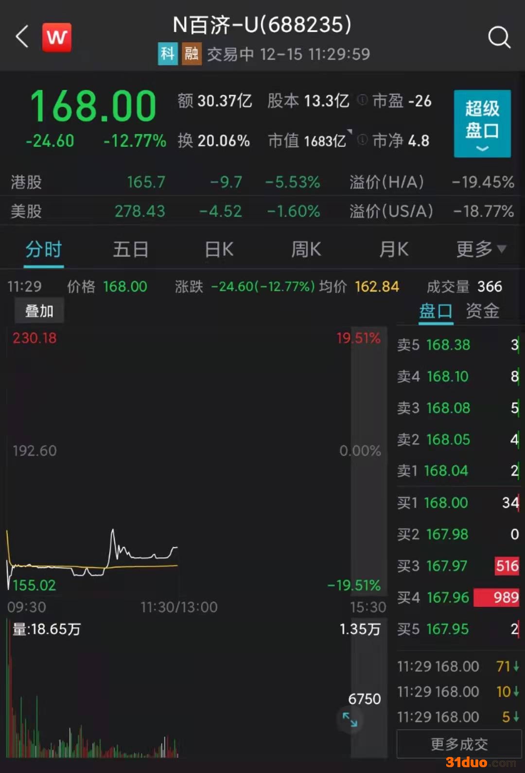 百济神州12月15日早盘走势 来源:Wind