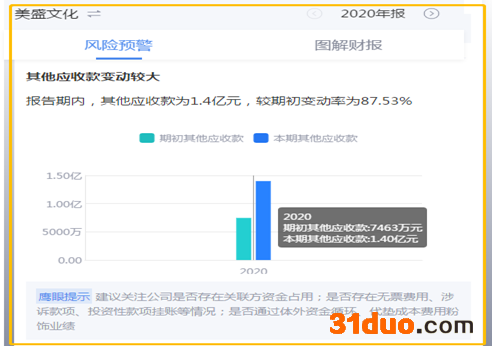 根据鹰眼预警我们发现,2020年公司其他应收款出现较大变动,公司财报同时有点存贷双高的特征。