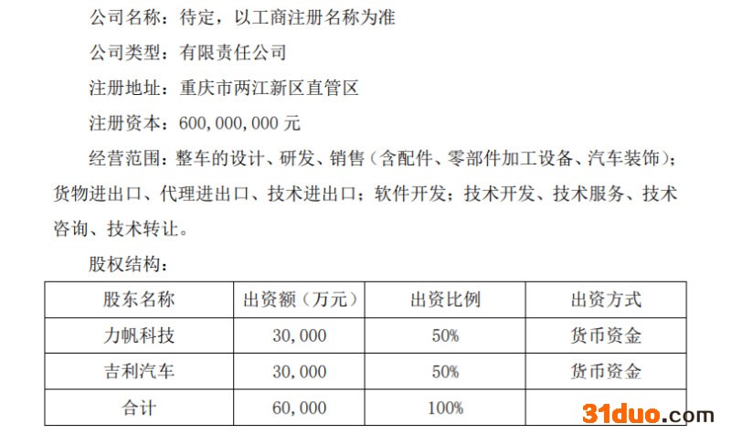 根据公告,合资公司设立在重庆市两江新区直管区,经营范围为整车设计、研发、销售(含配件、零部件加工设备、汽车装饰);货物进出口、代理进出口、技术进出口;软件开发;技术开发、技术服务、技术咨询、技术转让。公司设立股东会、董事会、监事会等,其中,董事会成员6人,力帆科技和吉利汽车各委派3名董事成员。合资公司总经理、副总经理、财务负责人等高级管理人员均由力帆科技提名并经合资公司董事会决定聘任。