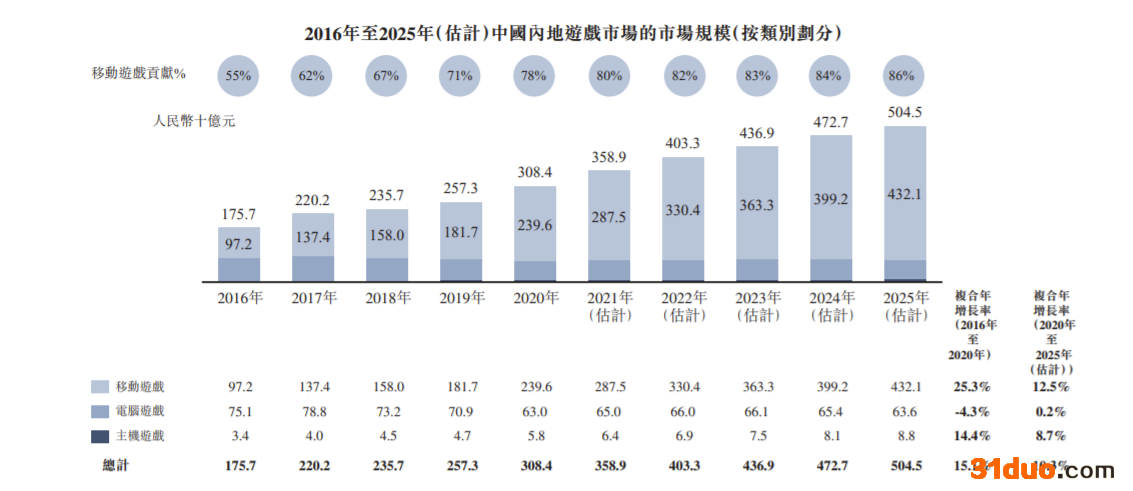 从行业发展来看,中国游戏市场已成为全球最大游戏市场,2020年的市场规模为人民币3,084亿元。预期中国游戏市场的市场规模将于2025年进一步增至人民币5,045亿元,2020年至2025年的复合年增长率为10.3%,超逾全球游戏市场同期的预期复合年增长率7.3%。