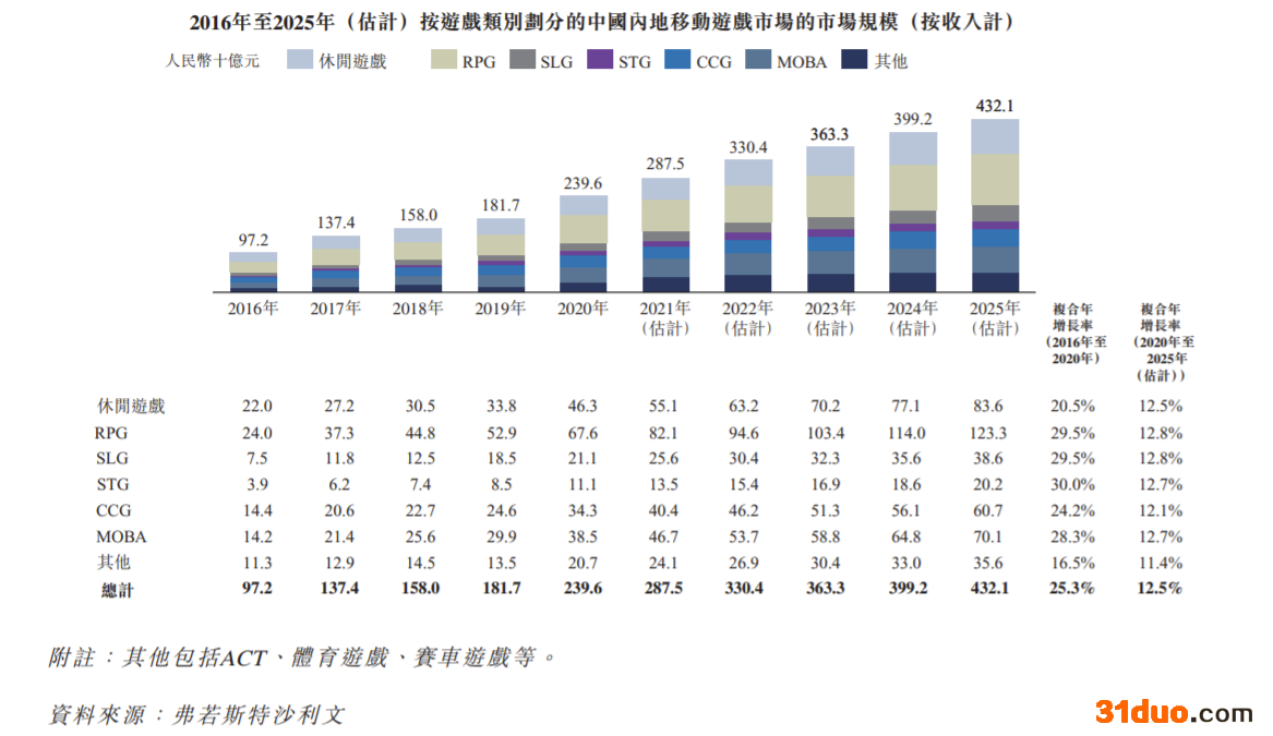 中国休闲游戏市场预期由2020年的人民币463亿元增至2025年的人民币836亿元。中国RPG市场预期由2020年的人民币676亿元增至2025年的人民币1,233亿元。此外,于2020年在中国所有游戏类型中,休闲游戏拥有最大用户群,预期于2025年将维持不变。