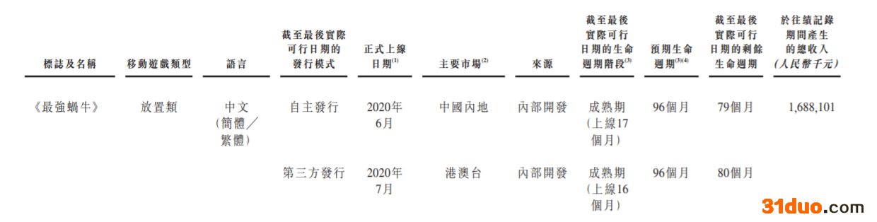 青瓷游戏的标志性移动游戏《最强蜗牛》于2020年6月推出后首个月内录得流水超过人民币4亿元,2020年6月至12月的平均MAU为440万人。《最强蜗牛》在2020年中国iOS游戏畅销榜上排名第二。此款游戏于2020年及截至2021年6月30日止六个月分别产生收入人民币11.7亿元及人民币5.165亿元,分别占该等期间总收入的95.3%及67.7%。