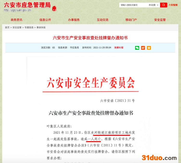 《事故通知》中,六安市安全生产委员会指出,2021年11月23日,叶集区史河街道江南府项目工地内发生一起高处坠落事故,造成一人死亡。根据《六安市安全生产事故查处挂牌督办办法》(六市安【2021】11号)规定,市安委会对该起事故的查处实行挂牌督办。要求叶集区按照相关要求予办理。