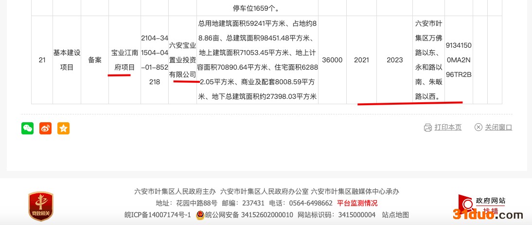 中华网财经获悉,据六安市政府官网2021年7月1日发布的《叶集区发改委2021年二季度企业投资项目备案结果》显示,上述事故项目叶集区史河街道江南府的项目法人单位为六安宝业置业投资有限公司。