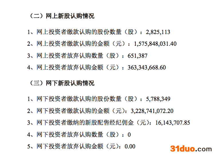 具体看,网上投资者缴款认购的股份数量为282.51万股,网上投资者缴款认购的金额为15.76亿元;网上投资者放弃认购数量达65.14万股,网上投资者放弃认购金额为3.63亿元;网下投资者未出现放弃认购情况。