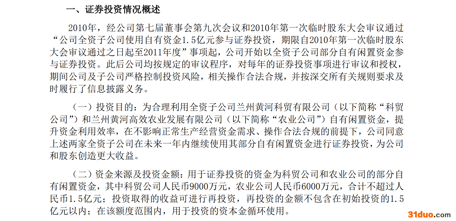 资金来源及投资金额方面,兰州黄河称,用于证券投资的资金为科贸公司和农业公司的部分自有闲置资金,其中科贸公司人民币9000万元,农业公司人民币6000万元,合计不超过人民币1.5亿元;投资取得的收益可进行再投资,再投资的金额不包含在初始投资的1.5亿元以内;在该额度范围内,用于投资的资本金循环使用。