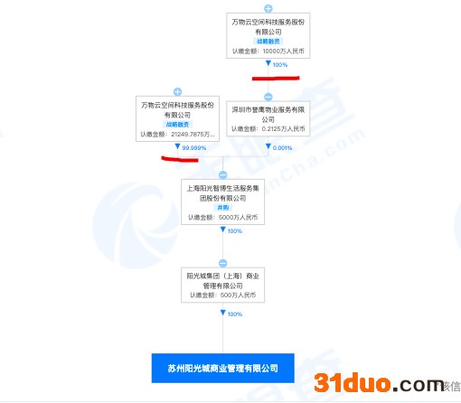 中华网财经从天眼查查询了解到,透过穿透股权关系,苏州阳光城商业管理有限公司是万物云空间科技服务股份有限公司(简称:万物云)全资子公司。