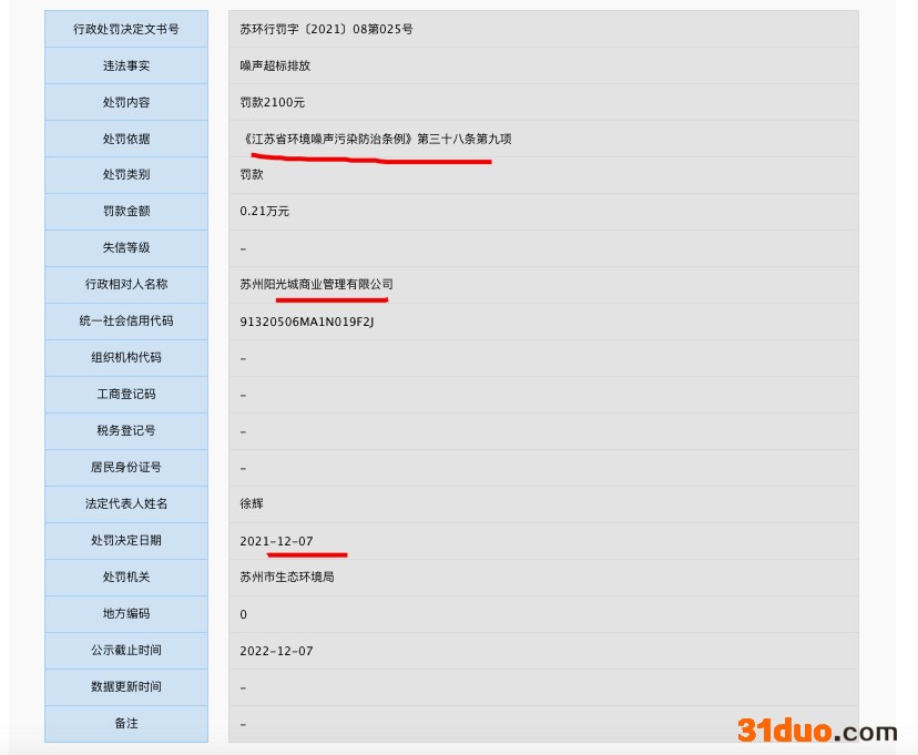 中华网财经12月15日讯:据信用中国江苏苏州官网消息,行政处罚决定文书号“苏环行罚字〔2021〕08第025号”显示,苏州阳光城商业管理有限公司因“噪声超标排放”的违法事实被罚,处罚决定日期为12月7日。