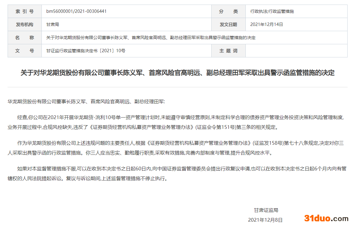 同时,甘肃证监局披露了关于对华龙期货股份有限公司董事长陈义军、首席风险官高明远、副总经理田军采取出具警示函监管措施的决定(甘证监行政监管措施决定书〔2021〕10号)。