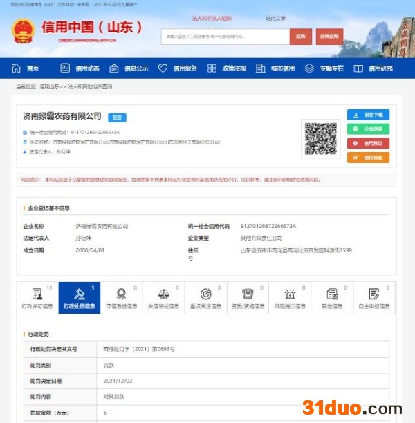 另外,信用中国(山东)官网披露的济农〔农药〕罚﹝2021﹞1号行政处罚决定书显示,因“当事人生产标签不符合规定农药”的行为,2021年3月30日,济南市农业农村局对山东绿霸作出“1.没收违法所得560元;2.并处罚款12000元;”的行政处罚决定。