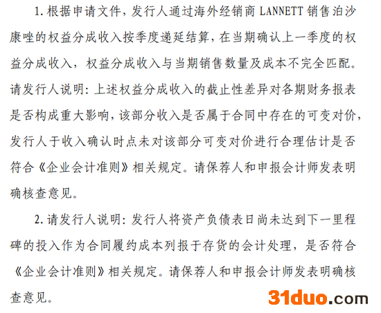 在上海证券交易所科创板上市委员会2021年第84次审议会议上,上市委对宣泰医药的现场问询集中在发行人来自海外经销商LANNETT销售泊沙康唑的递延权益分成收入的合理性及其影响、相应会计处理是否合规以及海外终端销售情况等问题。