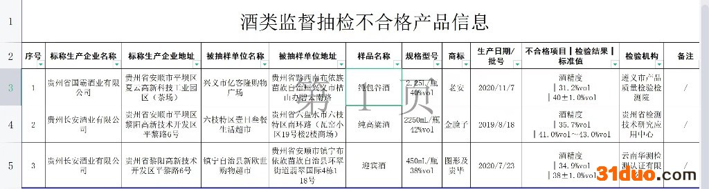新京报记者日前从贵州省市场监督管理局官网了解到,在其12月13日公布的29批次食品抽检不合格情况通报中,3批次酒类产品酒精度不合格。