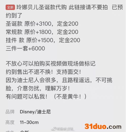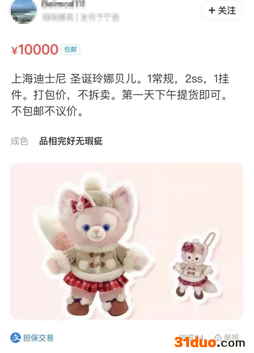 在某二手平台上搜索“玲娜贝儿”等关键词看到,有卖家介绍,原价219元的玲娜贝儿常规款加价1800元/只,圣诞款加价3100元/只,甚至连挂件都要加价1500元/只才能拿到。
