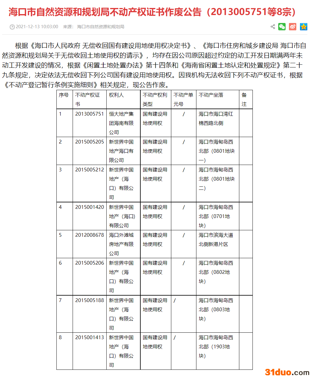 海口市自然资源和规划局于12月13日在官网公布了一则不动产权证书作废公告,中国恒大(03333.HK)下属多个公司所属地块被无偿收回。该则信息显示,根据《海口市人民政府无偿收回国有建设用地使用权决定书》、《海口市住房和城乡建设局海口市自然资源和规划局关于无偿收回土地使用权的请示》,均存在因公司原因超过约定的动工开发日期满两年未动工开发建设的情况,根据《闲置土地处置办法》第十四条和《海南省闲置土地认定和处置规定》第二十九条规定,决定依法无偿收回8宗国有建设用地使用权。