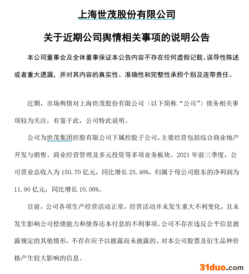 12月14日晚间,世茂股份(600823.SH)就近期公司舆情相关事项的说明公告。世茂股份称,公司为世茂集团控股有限公司下属控股子公司。目前,公司各项生产经营活动正常,经营活动并未发生重大不利变化,且未发生影响公司偿债能力和债券还本付息的不利事项。