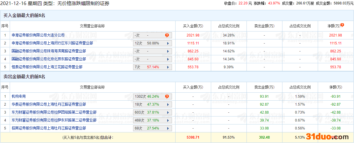 中国经济网北京12月16日讯 今日,物产环能(603071.SH)因属于无价格涨跌幅限制的证券而登上龙虎榜。截至今日收盘,物产环能每股报22.20元,涨幅43.97%,振幅23.99%,换手率2.65%,成交额5898.03万元,总市值123.87亿元。