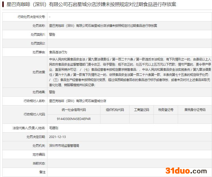 其中,12月13日发布的行政处罚决定书显示,星巴克咖啡(深圳)有限公司石岩星城分店涉嫌未按照规定对过期食品进行存放被立案,深圳市市场监督管理局依据《中华人民共和国食品安全法》第一百二十六条规定、《中华人民共和国食品安全法实施条例》第六十九条规定,对其警告。