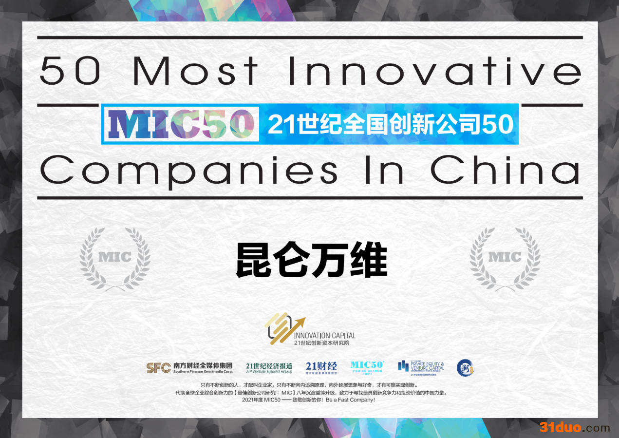 12月15日,国际著名创新榜单MIC50:21世纪创新公司50强(快公司FastCompany中国最佳创新公司50)发布。作为一家全球领先的互联网平台型公司,昆仑万维凭借创新的战略布局优势及在出海领域的影响力,从多家上市企业中脱颖而出,荣获21世纪(全国)创新公司50强。一同入围榜单的还包括腾讯、哔哩哔哩、歌尔股份等公司。