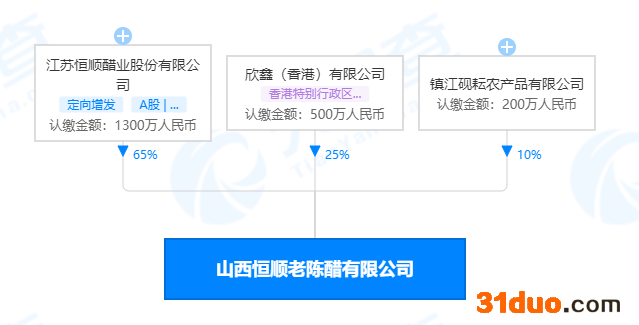 公开资料显示,山西恒顺原为山西恒顺四眼井老陈醋有限公司,2002年由欣鑫香港与恒顺醋业分别认缴500万元和1300万元成立。经过多轮实缴,在2012年,恒顺醋业出售10%股权给镇江砚耘,形成了现在的股权结构。