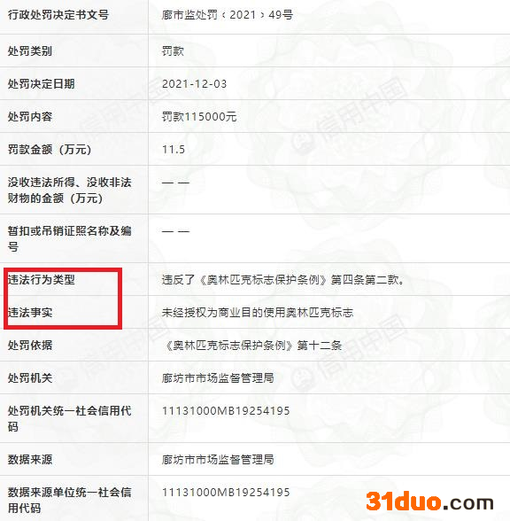 行政处罚决定书廊市监处罚﹝2021﹞49号显示,好丽友食品有限公司未经授权为商业目的使用奥林匹克标志,违反了《奥林匹克标志保护条例》第四条第二款规定。廊坊市市场监督管理局依据《奥林匹克标志保护条例》第十二条规定,对其罚款115000元,处罚日期为2021年12月3日。