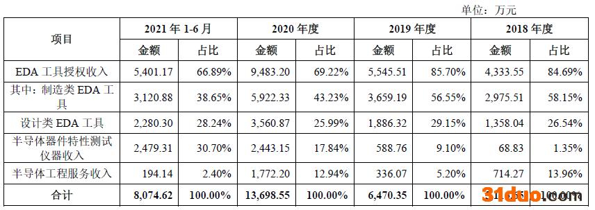 概伦电子主营EDA产品及其解决方案,主要业务分为EDA工具授权收入、半导体器件特性测试仪器收入和半导体工程服务收入。截至2021年6月末,上述三项业务营收占比分别为66.89%、30.7%、2.4%。