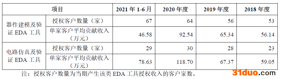 《科创板日报》记者注意到,在EDA工具授权业务中,单家客户平均贡献收入的不断提升是推动业务营收高增的主要驱动力。截至2021年6月末,设计类EDA工具单家客户平均贡献收入78.63万元,而制造类EDA工具为46.58万元。授权模式上,固定期限授权占82.43%、永久授权占17.57%。
