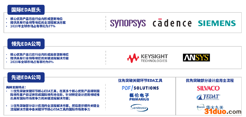 据了解,EDA行业不仅是技术高度密集的行业,而且具有十分明显的规模效应,EDA 企业一般会采取以内生增长与外延并购相结合的方式来实现企业长期发展与业务成长。例如国际领先企业新思科技、铿腾电子、西门子EDA等,成立至今均经历数十次甚至近百次并购并不断整合。目前上述三家公司处于垄断地位,行业高度集中。