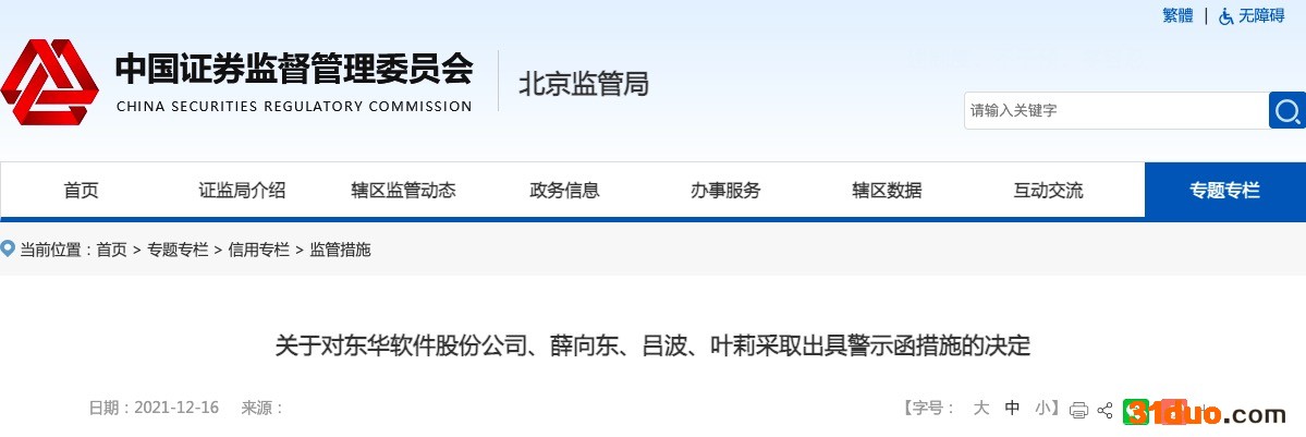 中华网财经讯,12月16日,据证监会消息,因2018年和2019年年度财务报告分别虚增营业收入6,522.63万元和3,623.27万元,北京证监局对东华软件、薛向东、吕波、叶莉出具警示函。