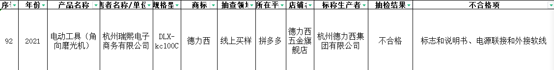 本次检查发现,标称杭州德力西集团有限公司于今年生产、杭州瑞熙电子商务有限公司销售的电动工具(角向磨光机)不合格,规格型号DLX-kc100C,商标德力西,抽查领域为线上买样(拼多多),店铺名德力西五金旗舰店,不合格项目为标志和说明书、电源联接和外接软线。