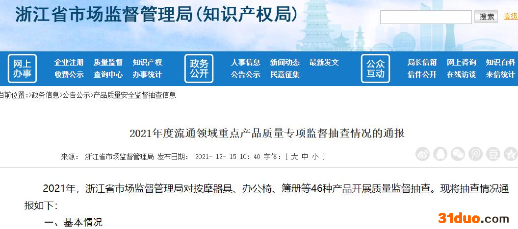 中国经济网北京12月16日讯 浙江省市场监督管理局(知识产权局)昨日发布《2021年度流通领域重点产品质量专项监督抽查情况的通报》,2021年,浙江省市场监督管理局对按摩器具、办公椅、簿册等46种产品开展质量监督抽查,共抽查2055批次产品,检出374批次产品不合格,不合格发现率为18.20%。抽查产品为按摩器具、办公椅、簿册、插头插座、车用柴油、车用尿素水溶液、车用汽油、等产品。其中,抽查了40批次电动工具产品,其中14批次产品不合格,不合格发现率为35.00%。不合格项目涉及标志和说明书、电源联接和外接软线。