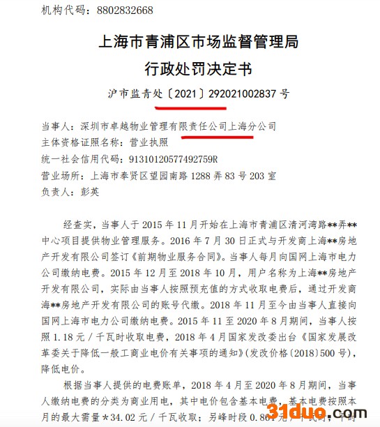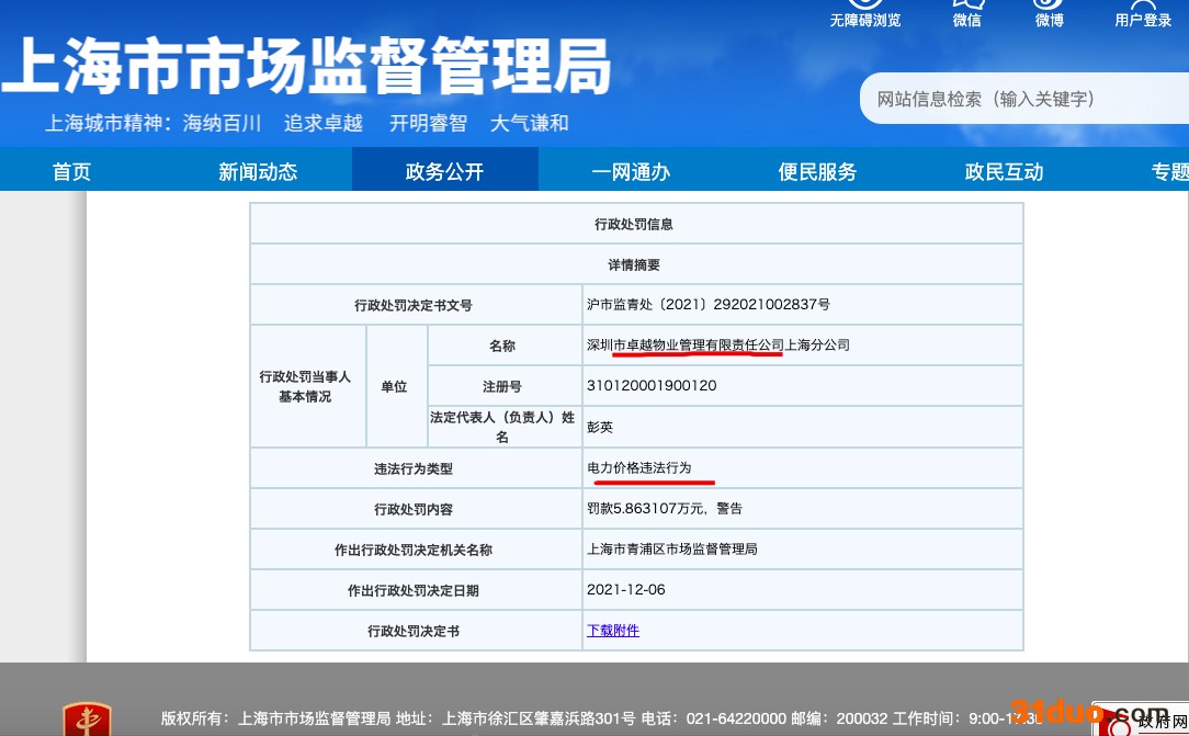 中华网财经12月16日讯:据上海市市场监督管理局网站消息,近日,深圳市卓越物业管理有限责任公司上海分公司违反了《中华人民共和国电力法》相关规定,被上海市青浦区市场监督管理局警告并处罚款人民币伍万捌仟陆佰叁拾壹圆零角柒分。处罚决定日期为2021年12月6日。