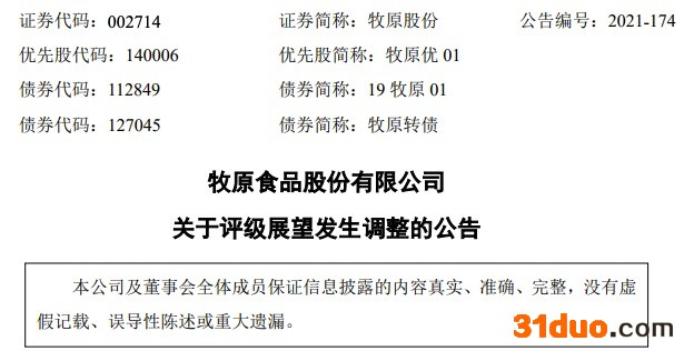 中华网财经讯,12月15日,牧原股份公告,2021年12月15日,公司收到中诚信国际信用评级有限责任公司(以下简称“中诚信国际”)出具的《关于将牧原食品股份有限公司评级展望调整为负面的公告》(信评委公告[2021]932号),中诚信国际对公司的评级展望进行了调整,具体情况如下:调整前中诚信国际审定公司的主体信用等级为AA+,评级展望为稳定;2021年12月15日,中诚信国际决定维持公司AA+的主体信用等级,将评级展望由稳定调整为负面;维持“19牧原01”、“20牧原MTN001”、“20牧原MTN002”和“牧原转债”AA+的债项信用等级。